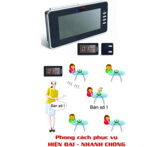 Hệ thống gồm có màn hình LCD Trung Tâm để nhận thông tin gọi phục vụ từ các bàn ( hoặc các phòng ) và các Nút Gọi đặt tại các bàn ( hoặc các phòng ) để Khách Hàng nhấn gọi phục vụ khi cần.